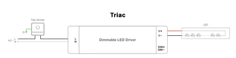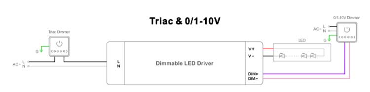 1. The Pulse-Width Modulation (PWM) of output voltage can be adjusted through input terminal of the AC phase line(L) by connection a phase /Triac dimmer or lighting system.